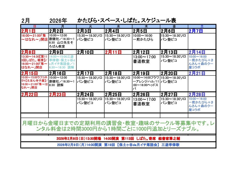 個別指導の学習塾、英語塾などの語学教室、手芸や華道等趣味の教室等を広く募集して、レンタル教室中心の運営となります。宴会など飲食を伴うレンタルはできません。2時間3000円から1時間増えるごとに1000円増とリーズナブルです。